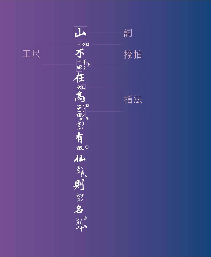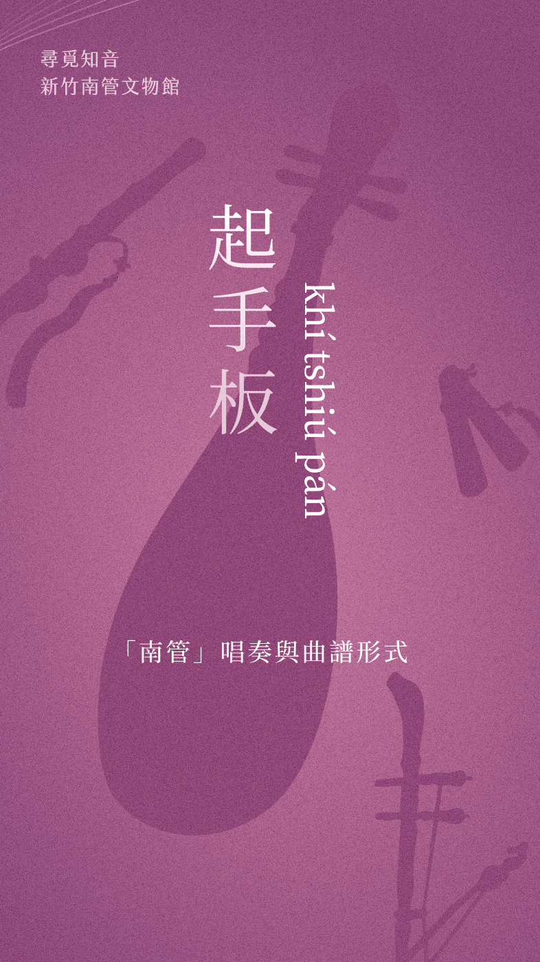 南管的音符,以五個基本符號表示。完整樂譜以琵琶彈奏的音符(工尺)、指法、節奏(撩拍)為主體,曲詞則書寫在工尺之間。
