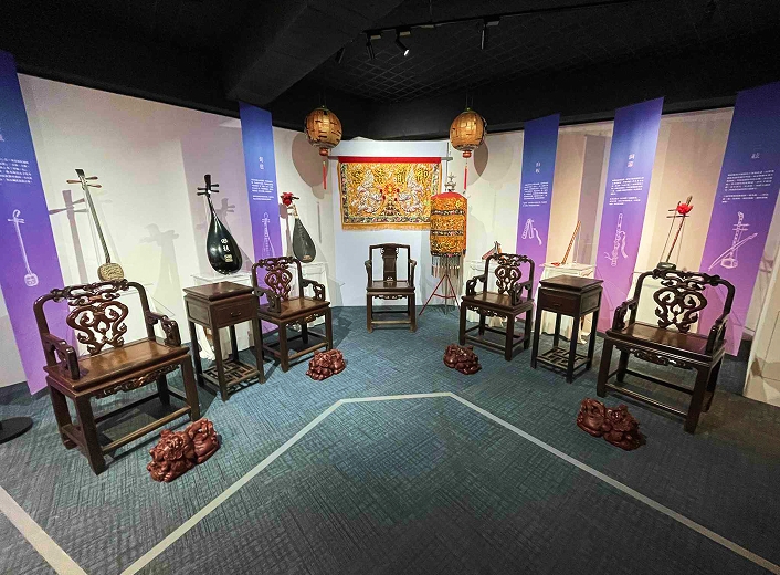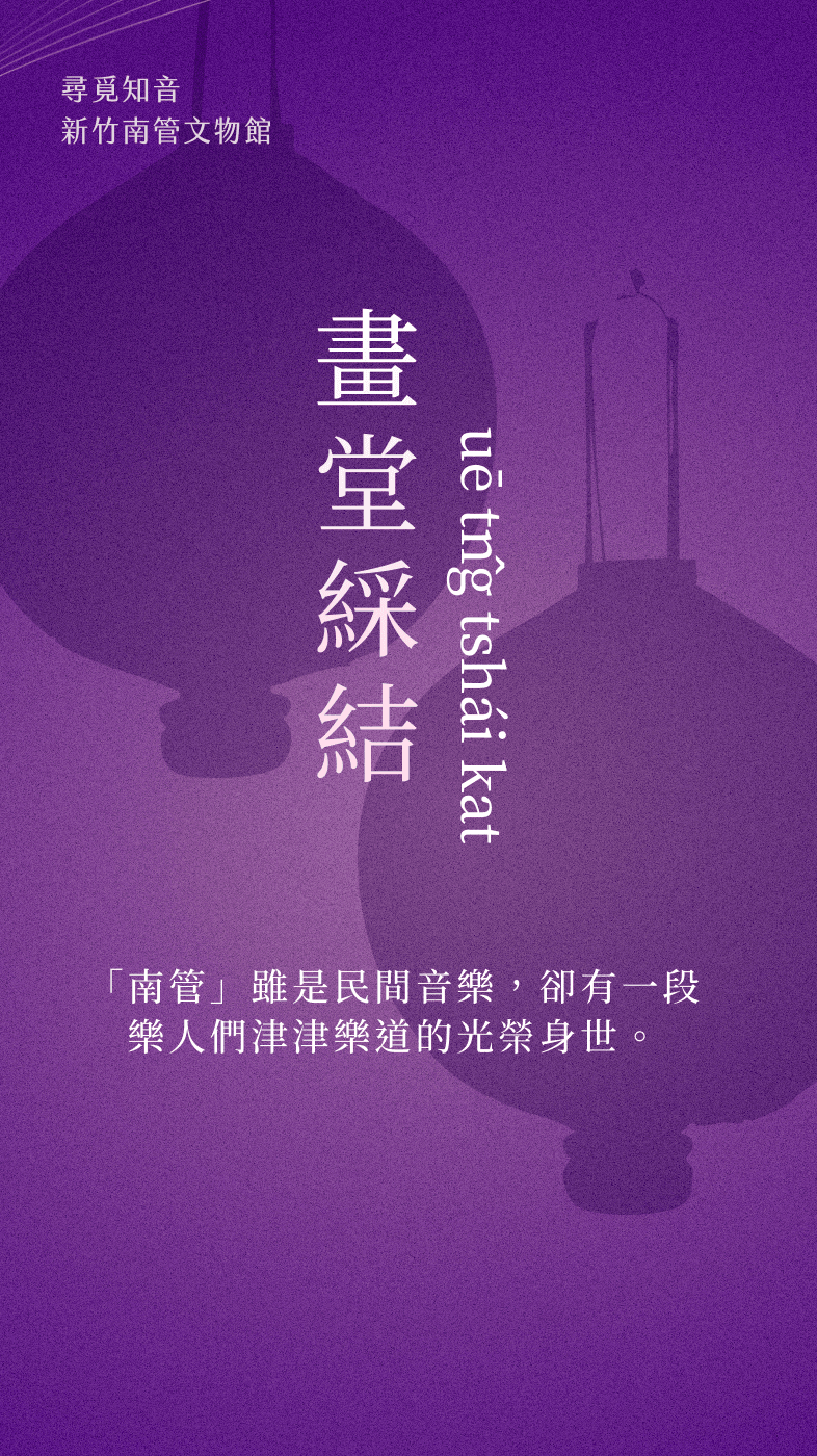 本次特展依循傳統,設置太師椅、踏獅,張掛「御前清客」綵匾、綵傘,高懸烏紗燈,重現南管唱奏的典儀場景。陳列的綵傘,為新竹「崇孟社」於1973年備置,繡工典雅精緻。長和南樂社的烏紗燈,是榮獲教育部第六屆「傳統藝術薪傳獎」的崇孟社社員謝水木先生所作。演奏樂器所用的兩對踏獅,則為新竹市指定的「鑿花工藝技術保存者」蔡楊吉先生精心刻製。
