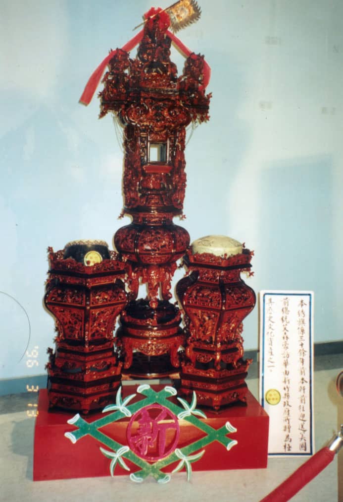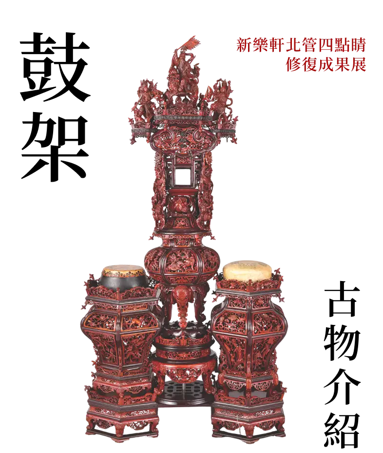 鼓架體積龐大,八角底座兩側為花籃造型鼓架,主軸由上而下配置閣樓、龍柱掛飾、象首花瓶及束腰圓几檯。通體精雕細琢,刻滿花鳥瑞獸博古奇珍以及神仙帶騎。中座下方四足束腰圓几原件佚失於本計畫完成修復仿作。