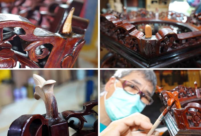 黏著前由修復師先在缺失處塗上隔離層,並在底部黏著一小塊Milliput環氧補土後,將仿作的木筆花黏著上去,再進行外形雕塑修飾及全色處理。