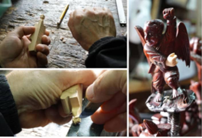 一件小天使的手。仿作時藝師並未在木頭上繪稿,而是在觀察自己握拳的手後直接雕刻。過程中一邊以游標卡尺來回量測尺寸,一邊快速地雕刻細微的手指。