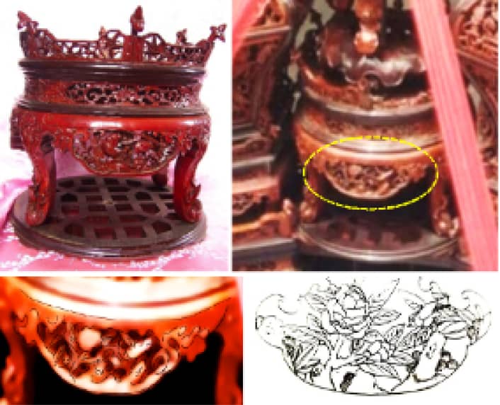 圓形凳狀檯座圖像資料不足,無法確認所有花片圖案。本計畫以老照片為底,勾勒出大致的構圖,再由藝師依其雕刻經驗與傳統工藝吉祥圖案之配置原則,繪製花鳥圖案。