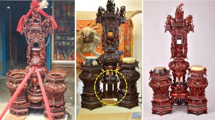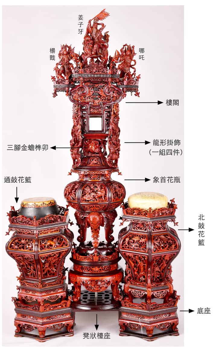 中軸配置閣樓、龍柱、象首花瓶及束腰圓几檯,兩側為花籃造型鼓架。通體精雕細琢,滿布花鳥瑞獸、博古奇珍。