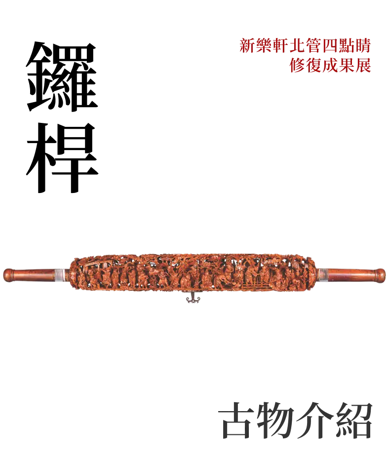 鑼桿整根木材透雕而成,用以承掛大銅鑼。兩面分刻文武題材一面雕「漁樵耕讀」,另一面雕「九曲黃河陣」。兩端圓棍為肩挑處。