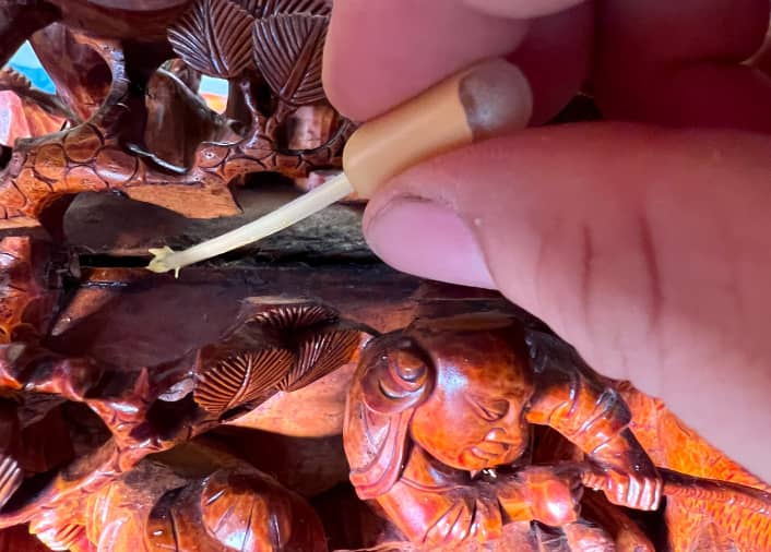 鑼桿中心開裂較深,注入的填補材料(兔皮膠+碳酸鈣)加入適當的水性顏料,使填料的色系與文物外觀一致,能較好的進行後續的全色。