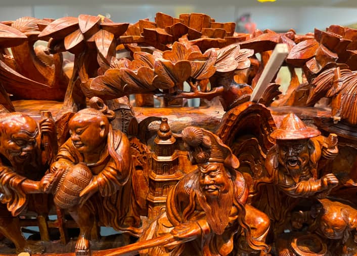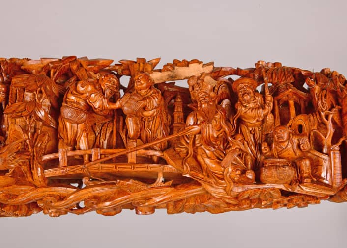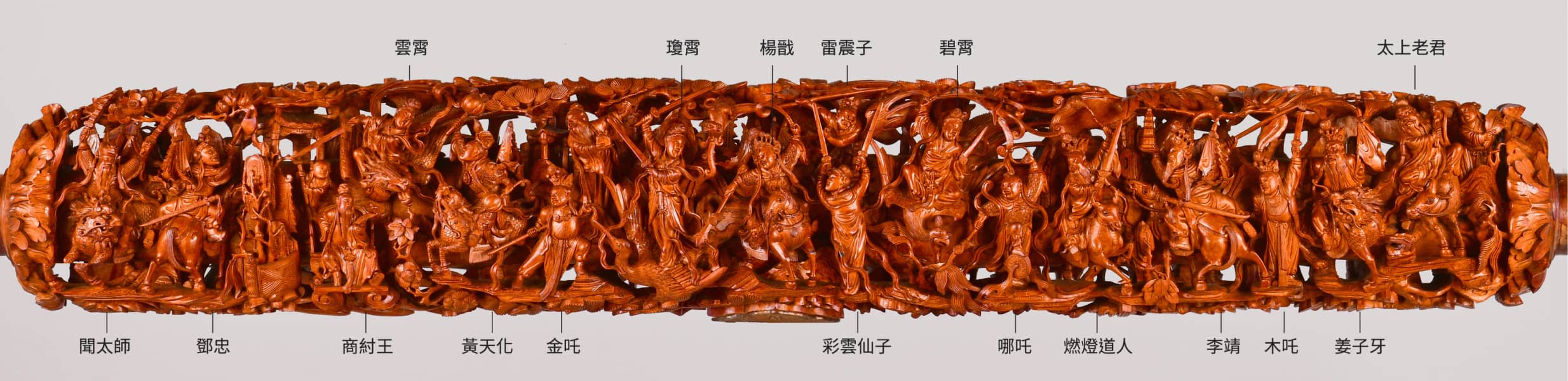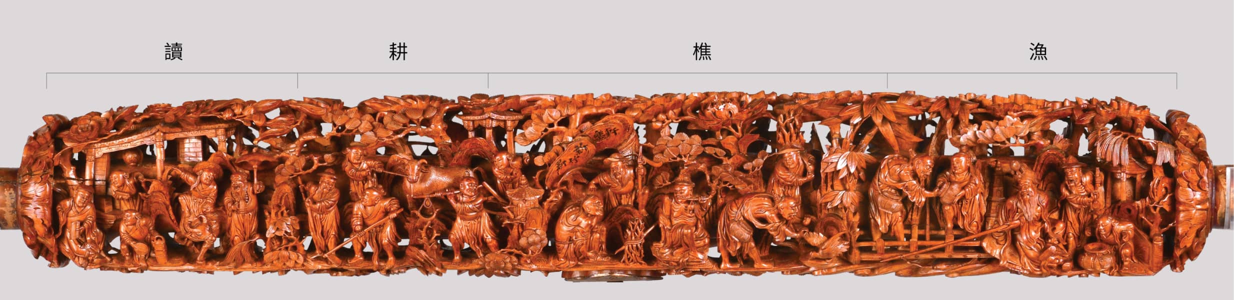 鑼桿兩側分刻文武題材,「文」面為「漁樵耕讀」,刻有漁夫、樵夫、農夫、烹茶讀書人,展現悠閒從容的生活。