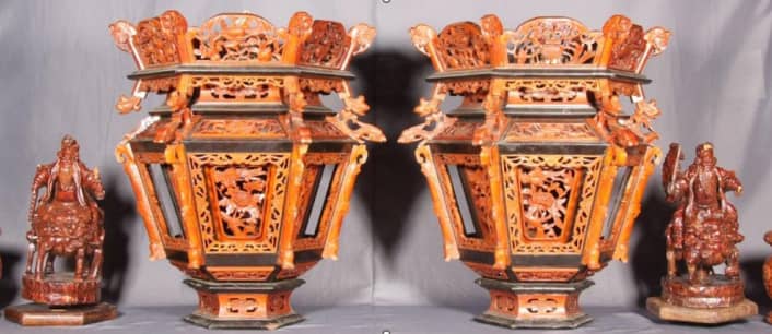 以紗質布料製作的子弟燈,演出時掛在戲臺口,出陣時高舉於陣頭前。燈罩下有精雕的六角燈斗,上為指路仙人。